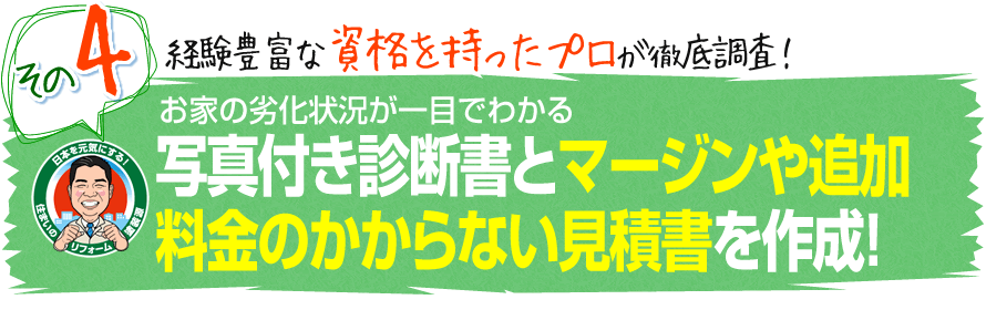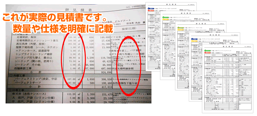 この劣化診断書を元に、細かい部位の数量や塗料名まで細部にこだわってた見積書をお渡しします。よくある「一式」ばかり書かれた1~2枚の雑な見積書とは違います。