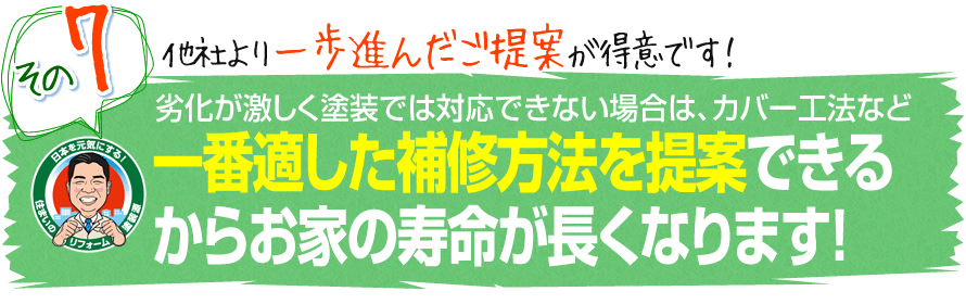 塗装で対応できないものは、私どもの徹底管理のもと、地元の優良な協力会社と一緒に補修します。対応できないから…といって塗装のみで誤魔化すことは絶対にしません。